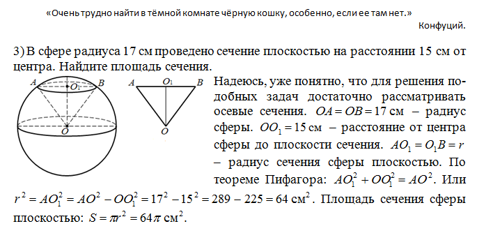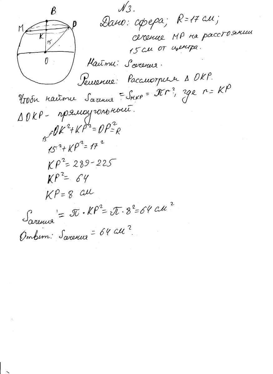 3)в сфере радиуса 17 см проведено сечение плоскостью на расстоянии 15 см от центра. Найдите площадь сечения