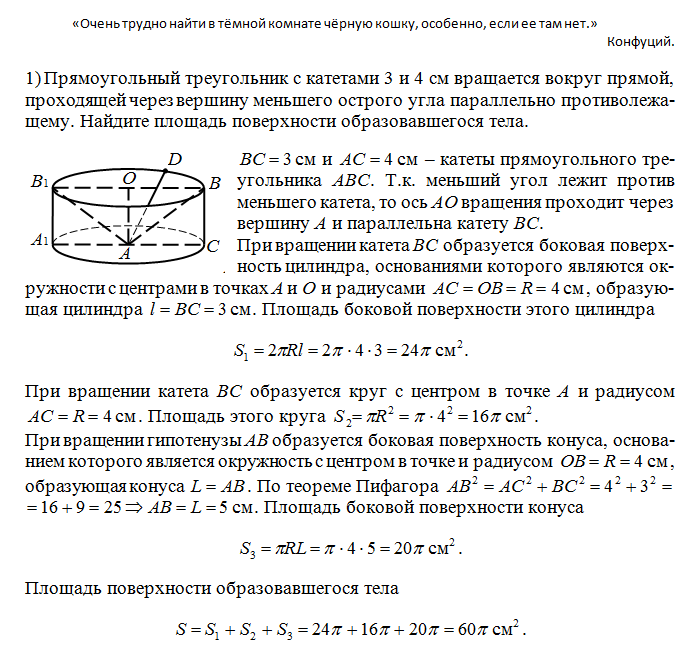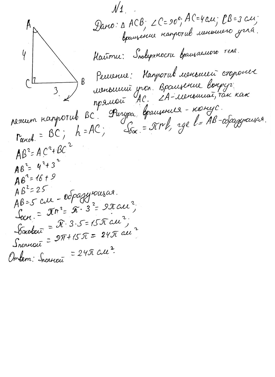 1)Прямоугольный треугольник с катетами 3 и 4 см вращается вокруг прямой,проходящей через вершину меньшего острого угла параллельно противолежащему. Найдите площадь поверхности образовавшегося тела.