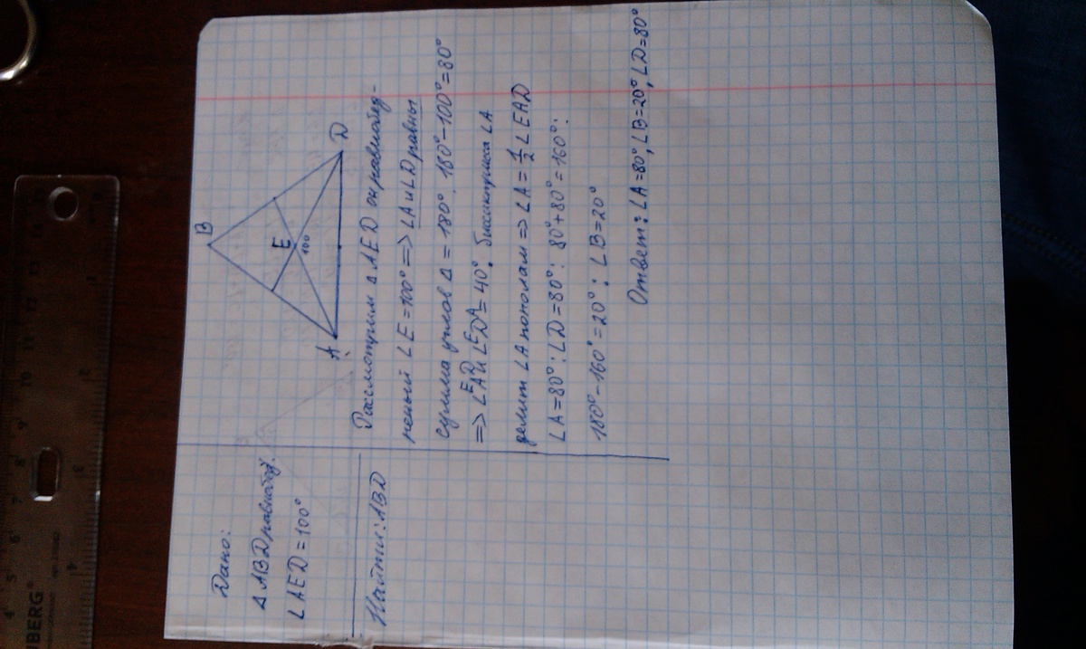 АВD - равнобедренный треугольник . АD - основание . Биссектрисы углов А и D пересекается в точке Е . Угол АЕD треугольника АЕД равен 100 градусам. Найдите углы треугольника АВD .