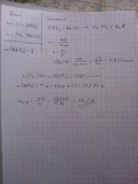 вычислите массу раствора азотной кислоты с массовой долей 35%, необходимой для полной нейтрализации раствора, содержащего 37 г гидроксида калия.