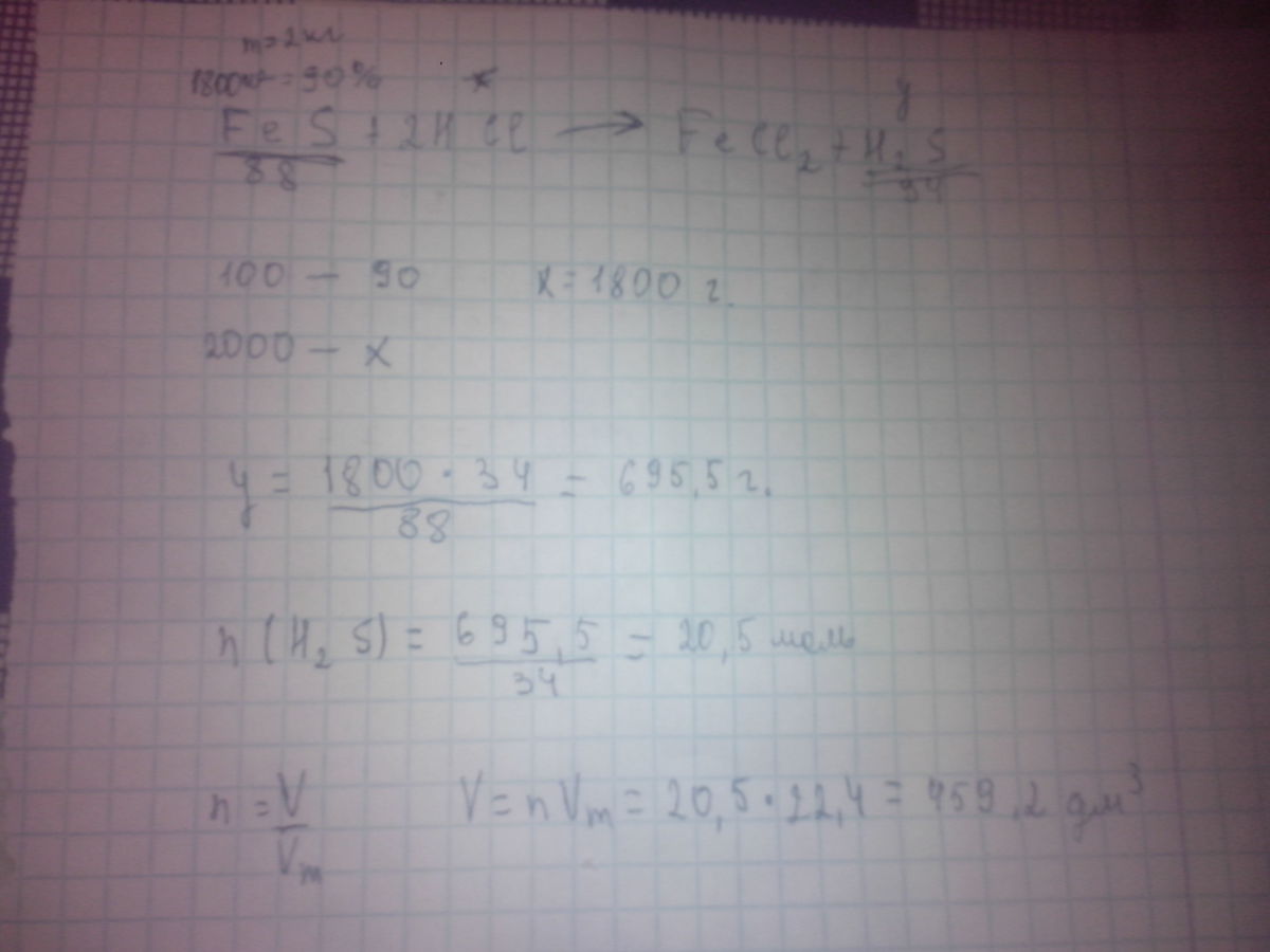 определите объем сероводорода образовавшегося при реакции соляной кислоты с 2кг руды содержащей 90% сульфида железа