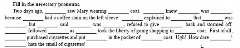 Two days ago, Ann(she) saw Mary wearing her coat. She knew it was her because it had a coffee staim on the left sleeve. Mary explained to Ann that it was Ann's, but she said it was her, refused to give it back and stormed off.