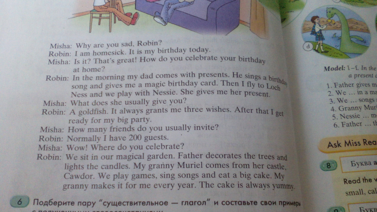 Мы сидим в нашем волшебном саду. Мой папа украшает деревья и зажигвет свечи. Моя бабушка приезжает из своего замка Кавдор. Мы играем в игры, поем песни и едим большой торт. Моя бабушка готовит его для меня каждый год. Торт всегда очень вкусный.