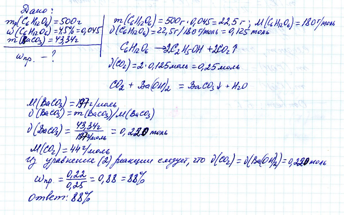 Спиртовому брожению подвергли 500 г раствора глюкозы с массовой долей 4,5 %. Образовавшийся газ пропустили через избыток раствора гидроксида бария, при этом образовалось 43,34 г осадка. Вычислите выход реакции процесса брожения глюкозы.