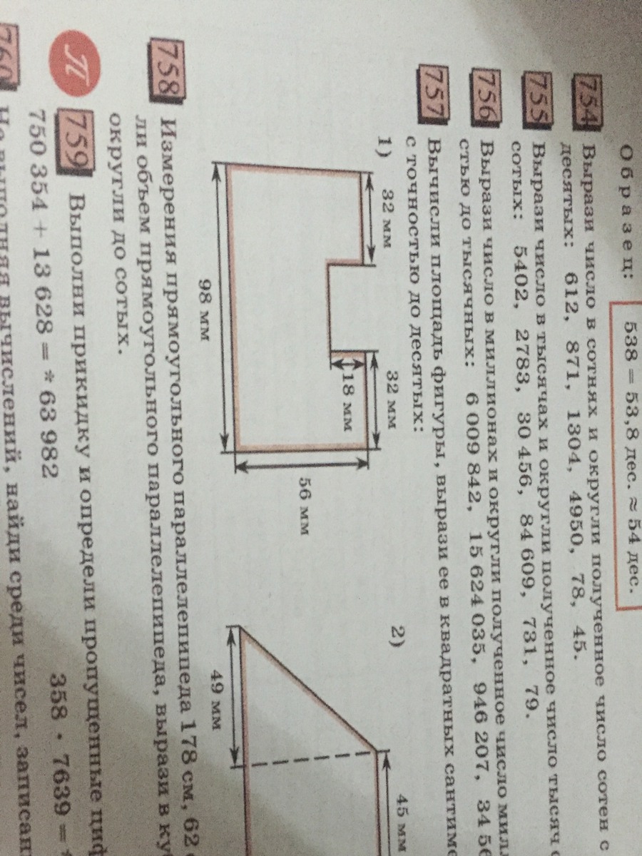 1)32 + 32 = 64 ; 2)98 - 64 = 34 ; 3) 34 × 18 = 612 ; 4) 98 × 56 = 5488 ; 5)5488 - 612 = 4876 Ответ : 487.6 см На второй я не увидел задание полностью Сорян...