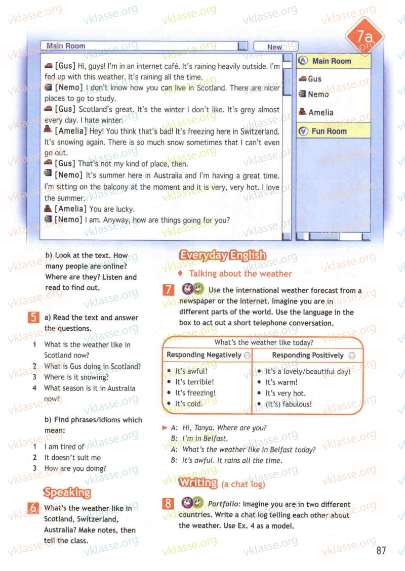G:Привет,ребята!Я в интернет кафе.На улице очень сильный дождь.Мне надоела эта погода.Всевремя идет дождь.