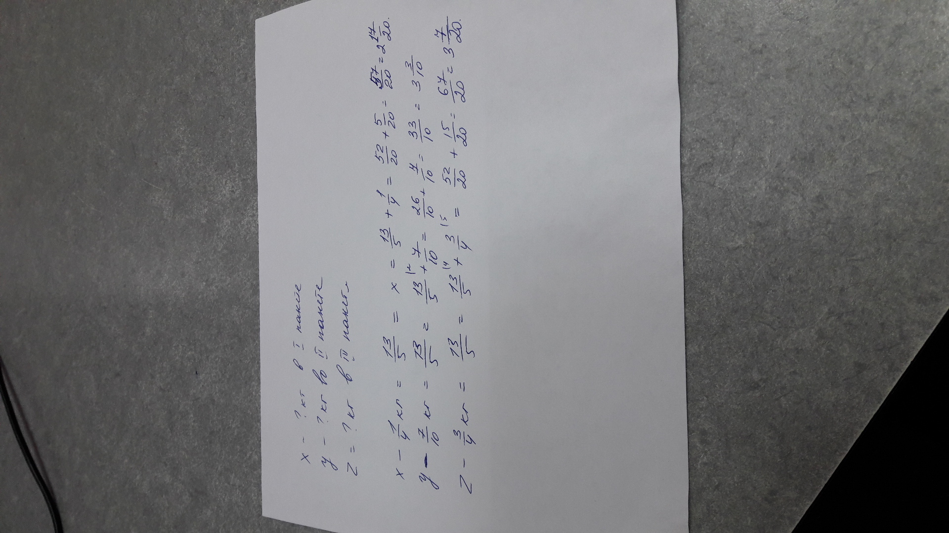 в трех пакетах был творог .когда из первого пакета взяли 14 кг. из второго 710 кг. а из третьего 34 то в каждом пакете сталось по 1 35 кг. сколько творога было в каждом пакете ??