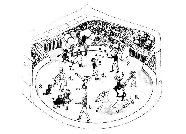 say what numbers they are in the picture.1)rhe circus in number one.2) the ring is number.....3) the trained dog chimps are number.....4)the trained dog number........5)the trained is number...... 6)the acrobats the number...... 7)the jugglers are number.....8)the clowns are number......9)the horse rider is number ...10)the musicians Are number... 11) The auduence is number ПОГИТЕ Пж.