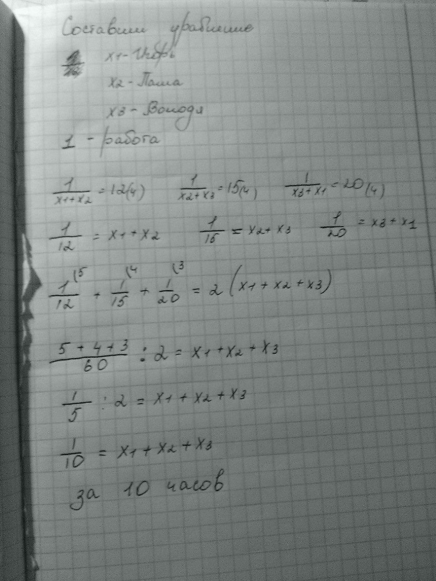 нужно составить уравнение с тремя неизвестными. сумма x1(Игоря)+х2(Паши)+х3(Володи)=будет общим временем работы