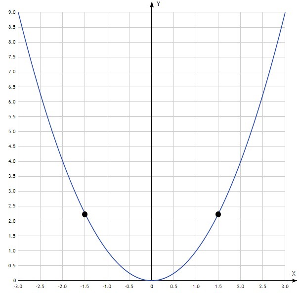 - парабола, с вершиной в точке (0;0) и с ветвями, направленными вверх. На рисунке отмечены точки, в которых