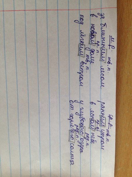запиши словосочетания в два столбика в зависимости от рода имён прилагательных за ближним лесом, ранним утром, в ясном небе, в новом доме, под лёгким ветром, у глубокого озера, от горячего солнца обозначь окончание прилагательных укажи падеж