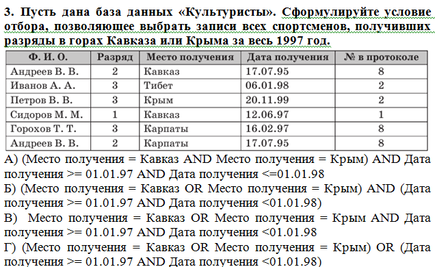 Пусть дана база данных «Культуристы». Cформулируйте условие отбора, позволяющее выбрать записи всех спортсменов, получивших разряды в горах Кавказа или Крыма за весь 1997 год срочно!!!!!