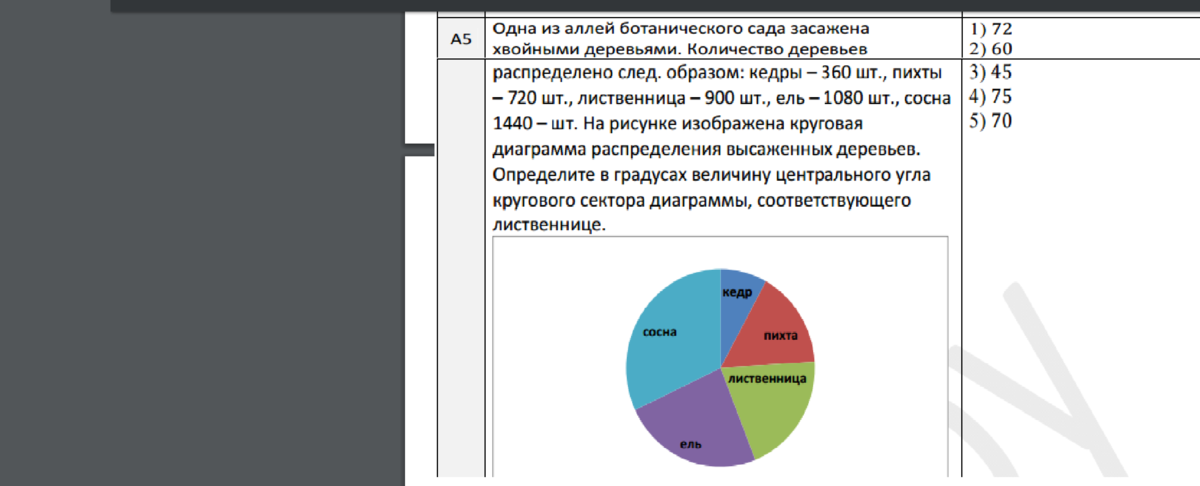 Складываем все числа, получаем 4500. Делим 4500 на 900, получаем 5 - это доля лиственницы в круге. В круге, как известно, 360 градусов, поэтому делим 360 на 5, получаем 72.