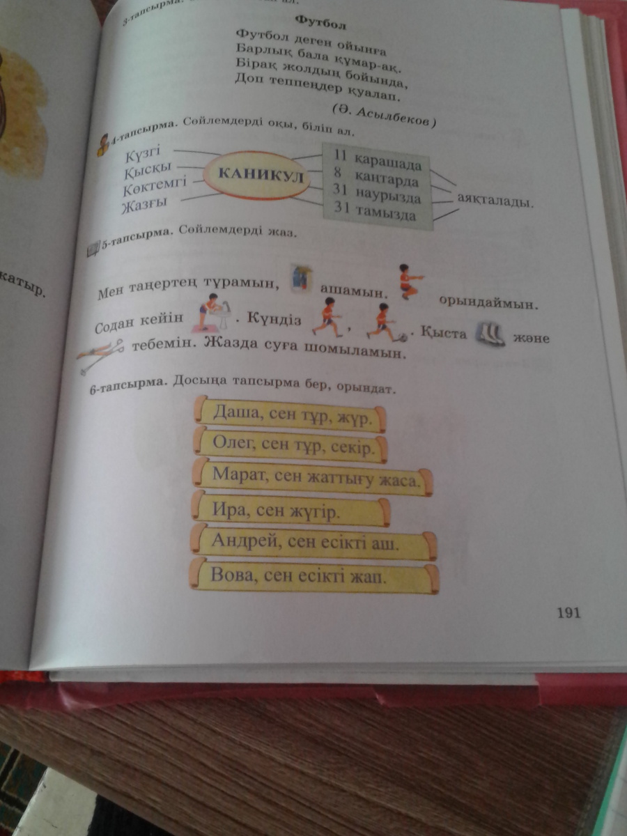 Мен танертен жуынуга есикты ашамын.Жаттыгу орындаймын.Содан сон жуынамын.Далпда журип,ойнаймын.Кыста коньки жане шана тебемин.Жазда суга шомыламын.