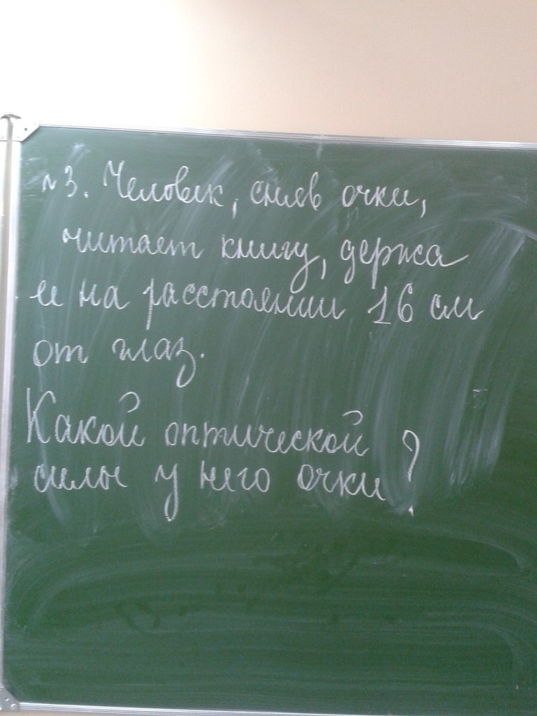 Расстояние нормального зрения равно 40 см. Человек читает книгу на расстояниии 16 см, значит он близорукий. Ему нужны очки с рассеивающими линзами, т.е. D<0