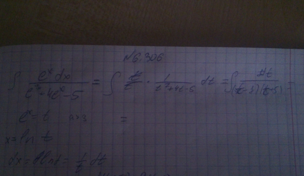 ![int { frac{ e^x dx }{ e^{2x} + 4e^x - 5 } } = int { frac{ de^x }{ (e^x)^2 - [1-5]e^x + [1][-5] } } = int { frac{ de^x }{ ( e^x - 1 ) ( e^x + 5 ) } } = \\ = frac{1}{6} int { ( frac{ 1 }{ e^x - 1 } - frac{ 1 }{ e^x + 5 } ) } , de^x = frac{1}{6} ( int { frac{ d(e^x-1) }{ e^x - 1 } } - int { frac{ d(e^x+5) }{ e^x + 5 } } ) = \\ = frac{1}{6} ( ln{|e^x-1|} - ln{|e^x+5|} ) = frac{1}{6} ln{frac{ |e^x-1| }{ |e^x+5| } } ; int { frac{ e^x dx }{ e^{2x} + 4e^x - 5 } } = int { frac{ de^x }{ (e^x)^2 - [1-5]e^x + [1][-5] } } = int { frac{ de^x }{ ( e^x - 1 ) ( e^x + 5 ) } } = \\ = frac{1}{6} int { ( frac{ 1 }{ e^x - 1 } - frac{ 1 }{ e^x + 5 } ) } , de^x = frac{1}{6} ( int { frac{ d(e^x-1) }{ e^x - 1 } } - int { frac{ d(e^x+5) }{ e^x + 5 } } ) = \\ = frac{1}{6} ( ln{|e^x-1|} - ln{|e^x+5|} ) = frac{1}{6} ln{frac{ |e^x-1| }{ |e^x+5| } } ;](https://tex.z-dn.net/?f=+int+%7B+frac%7B+e%5Ex+dx+%7D%7B+e%5E%7B2x%7D+%2B+4e%5Ex+-+5+%7D+%7D+%3D+int+%7B+frac%7B+de%5Ex+%7D%7B+%28e%5Ex%29%5E2+-+%5B1-5%5De%5Ex+%2B+%5B1%5D%5B-5%5D+%7D+%7D+%3D+int+%7B+frac%7B+de%5Ex+%7D%7B+%28+e%5Ex+-+1+%29+%28+e%5Ex+%2B+5+%29+%7D+%7D+%3D+%5C%5C+%3D+frac%7B1%7D%7B6%7D+int+%7B+%28+frac%7B+1+%7D%7B+e%5Ex+-+1+%7D+-+frac%7B+1+%7D%7B+e%5Ex+%2B+5+%7D+%29+%7D+%2C+de%5Ex+%3D+frac%7B1%7D%7B6%7D+%28+int+%7B+frac%7B+d%28e%5Ex-1%29+%7D%7B+e%5Ex+-+1+%7D+%7D+-+int+%7B+frac%7B+d%28e%5Ex%2B5%29+%7D%7B+e%5Ex+%2B+5+%7D+%7D+%29+%3D+%5C%5C+%3D+frac%7B1%7D%7B6%7D+%28+ln%7B%7Ce%5Ex-1%7C%7D+-+ln%7B%7Ce%5Ex%2B5%7C%7D+%29+%3D+frac%7B1%7D%7B6%7D+ln%7Bfrac%7B+%7Ce%5Ex-1%7C+%7D%7B+%7Ce%5Ex%2B5%7C+%7D+%7D++%3B+)
