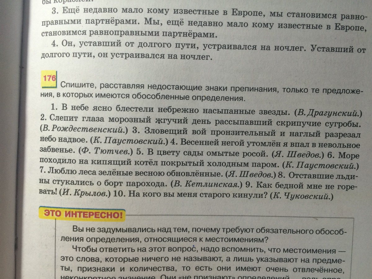 1. В небе ясно блестели небрежно насыпанные звезды. 2. Слепит глаза морозный, жгучий день, рыссыпавший скрипучие сугробы. 3. Зловещий вой, пронзительный и наглый, разрезал небо надвое. 4. Весенней негой утомлен, я впал в невольное забвенье. 6. Море походило на кипящий котел, покрытый холодным паром. 7. Люблю леса зелёные, росою обновленные. 8. Отставшие льдины стукались о борт парохода. 9. Как бедной мне не горевать! 10. На кого вы меня, старого, кинули?