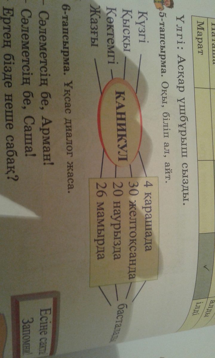 здесь ничего сложного к[]зг[] каникул 4 карашада басталады кыскы каникул 30 желтоксанда басталады к[]ктемг[] каникул 20наурызда басталады жаз[]ы каникул 26 мамырда басталады