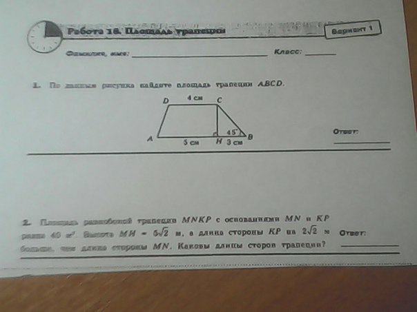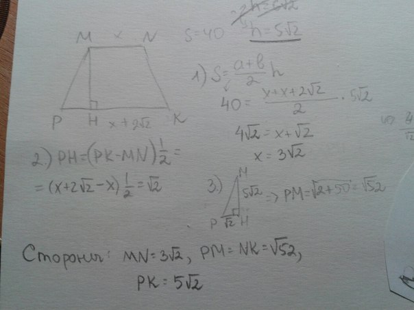 Площадь равнобокой трапеции mnkp с основаниями mn и kp равно 40м^2. высота mh=5( или 6) корней из 2 м, а длина стороны kp на 2 корня из 2 м больше, чем длина стороны mn. каковы длины сторон трапеции?
