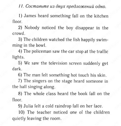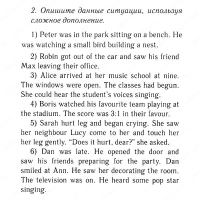 1) Петр был в парке, сидя на скамейке. Он смотрел на маленькую птицу строит гнездо. 2) Робин вышел из машины и увидел своего друга Макса выходя из своего офиса. 3) Алиса прибыла в ее музыкальной школе в девять. Окна были открыты. Классы начались. Она могла слышать голоса студента пение 4) Борис наблюдал за его iavourite команда играет на стадионе. Счет стал 3: 1 в их пользу. 5) Сара больно ногу и начал плакать. Она видела, как ее соседка Люси пришел к ней и прикоснуться к ней ее ногу осторожно. "Это больно, дорогая?" она спросила 6) Дэн опоздал. Он открыл дверь и увидел своих друзей готовились к партии. Дэн улыбнулся Энн. Он видел ее украшения комнаты. Телевизор был включен. Он услышал, как какой-то поп-звезда пение.