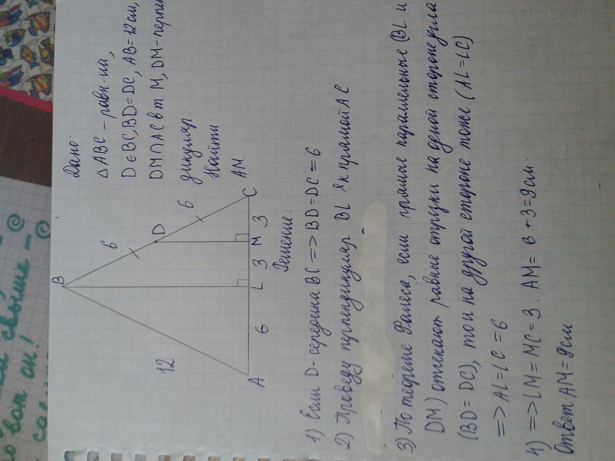 Из середины D стороны BC равностороннего треугольника ABC проведён перпендикуляр DM к прямой AC. Найдите AM, если AB=12см.