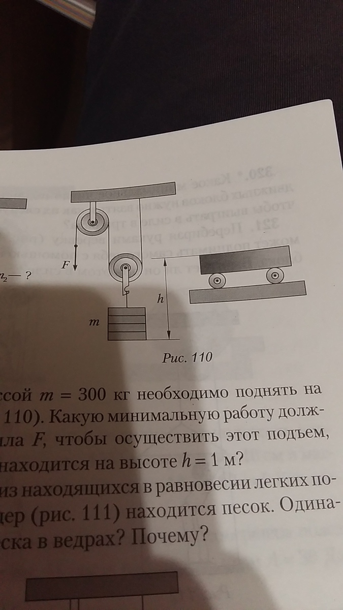 Груз массой m=300кг необходимо поднять на платформу(рисунок 110).Какую минимальную работу должна совершить сила F,чтобы осуществить этот подъём,если платформа находиться на высоте h=1м?