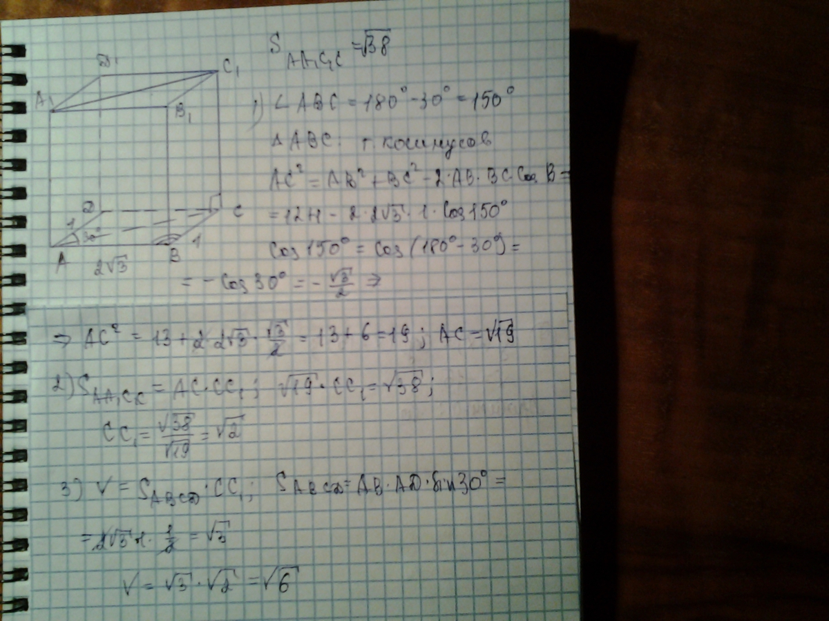 стороны основания прямого параллелепипеда равны 1 дм и 2 корня из 3 а угол между ними 30 найдите V параллелепипед если S большого диагонального сечения параллелепипеда равен корень 38