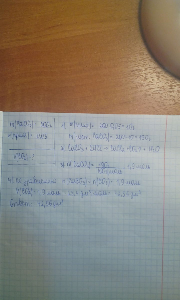 Найти объём газа, который выделиться при взаимодействии 200г извесняка содержащего 5% примесей с соляной кислотой.