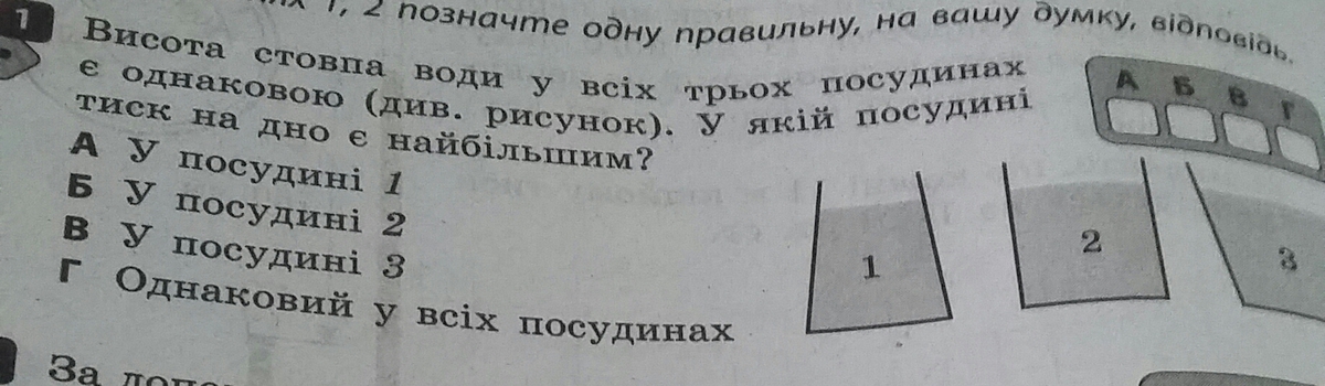 Нужно срочно Висота стовпа води у всіх трьох посудинах є однаковою (див.рисунку). У якій посудині тиск на дно є більшим?
