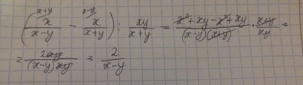 (x/x-y - x/x+y) : xy/x+y=(1-у-1+у):у+у=0:2*у=0