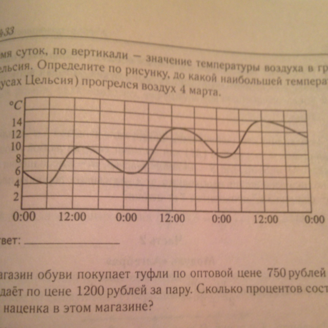 на рисунке показано изменение температуры воздуха на протяжении трех суток,начиная с 0часов 3 марта. По горизонтали отмечается время суток,по вертикали-значение температуры воздуха в градусах Цельсия. Определите по рисунку,до какой наибольшей температуры(в градусах Цельсия) прогрелся воздух 4 марта.
