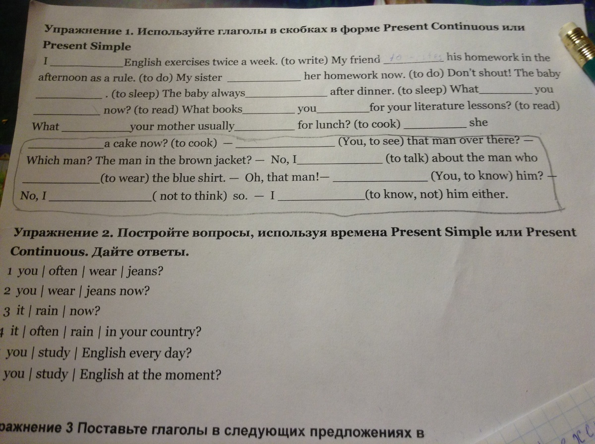 I write English exercises twice a week. My friend does his homework in the afternoon as a rule. My sister is doing her homework now. Don't shout! The baby is sleeping.The baby always sleeps after dinner. What are you reading now? What books do you read for your literature lessons? What does your mother usually cook for lunch? Is she cooking a cake now? - Do you see that man over there? - Which man? The man in the brown jacket? - No, I'm talking about the man who is wearing the blue shirt. - Oh, that man! - Do you know him? - No, I don't think so. - I don't know him either.