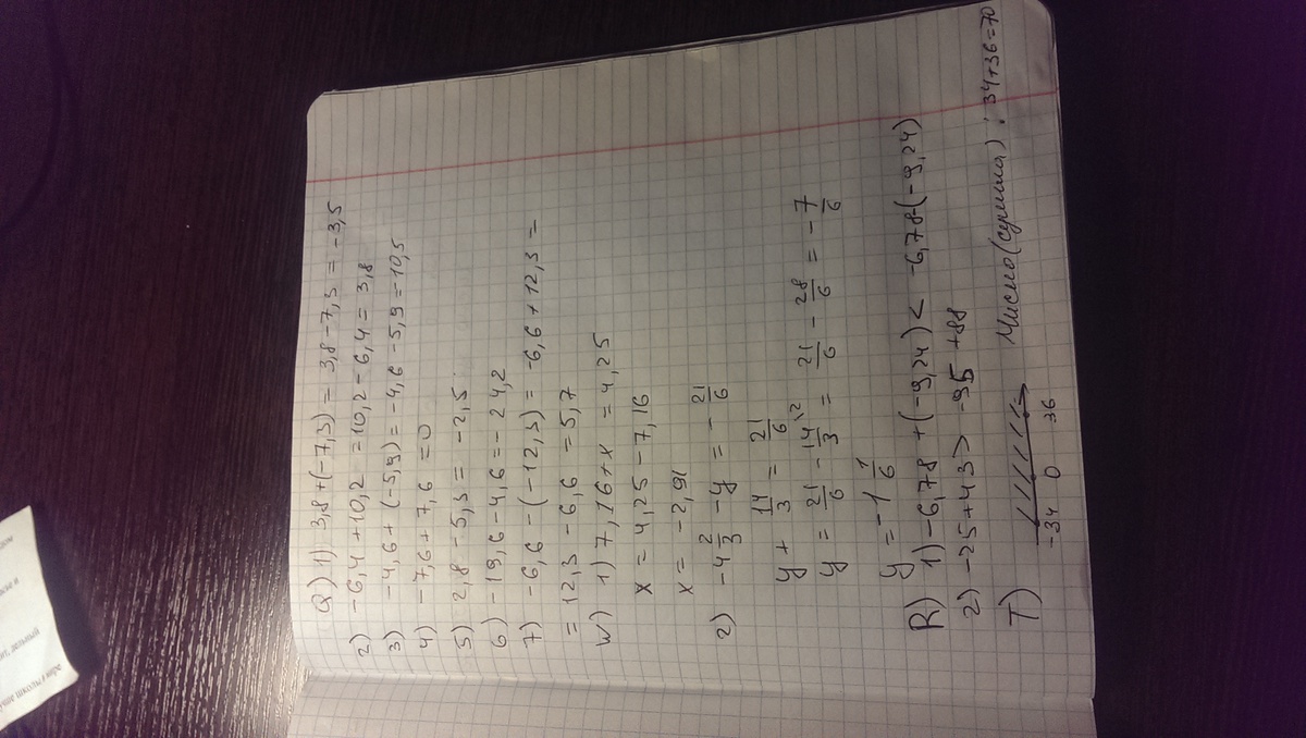 Q) 1) 3,8 + (-7,3)= ; 2) -6,4 + 10,2= ; 3) -4,6 + (-5,9)= ; 4) - 7,6 + 7,6= ; 5) 2,8 - 5,3= ; 6) - 19,6-4,6= ; 7) -6,6 - (-12,3)