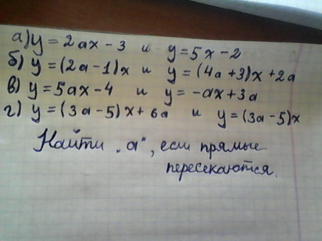 Если прямые пересекаются, то это означает, что существует решение системы из этих двух уравнений. Решим эту систему методом подстановки. 2ax-3=5x-2; x*(2a-5) = 3-2; x*(2a-5)=1;