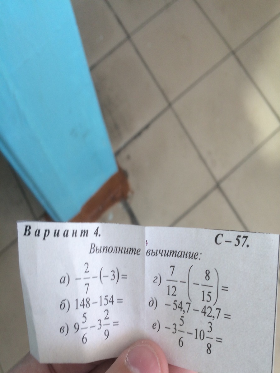 а) -2/7+3=2ц5/7; б)-(154-148)=-6; в) 9ц15/18-3ц4/18=6ц11/18; г) 7/12+8/15=35/60+32/60=67/60=1ц7/60; д) -(54,7+42,7)=-97,4; е) -(3ц5/6+10ц3/8)=-(3ц20/24+10ц9/24)=-13ц29/24=-14ц5/24 ц - целая