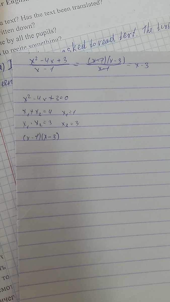 решаешь обычный дискриминвнт получается корни 1;3 это записывается (х-1)(х-3)/(х-1) сокращается и остается х-3