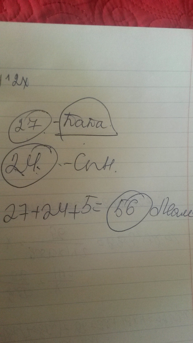 Папе 27 лет, а сын на 3 года моложе. Сколько маме лет, если она на 5 лет старше папы и сына вместе взятых?