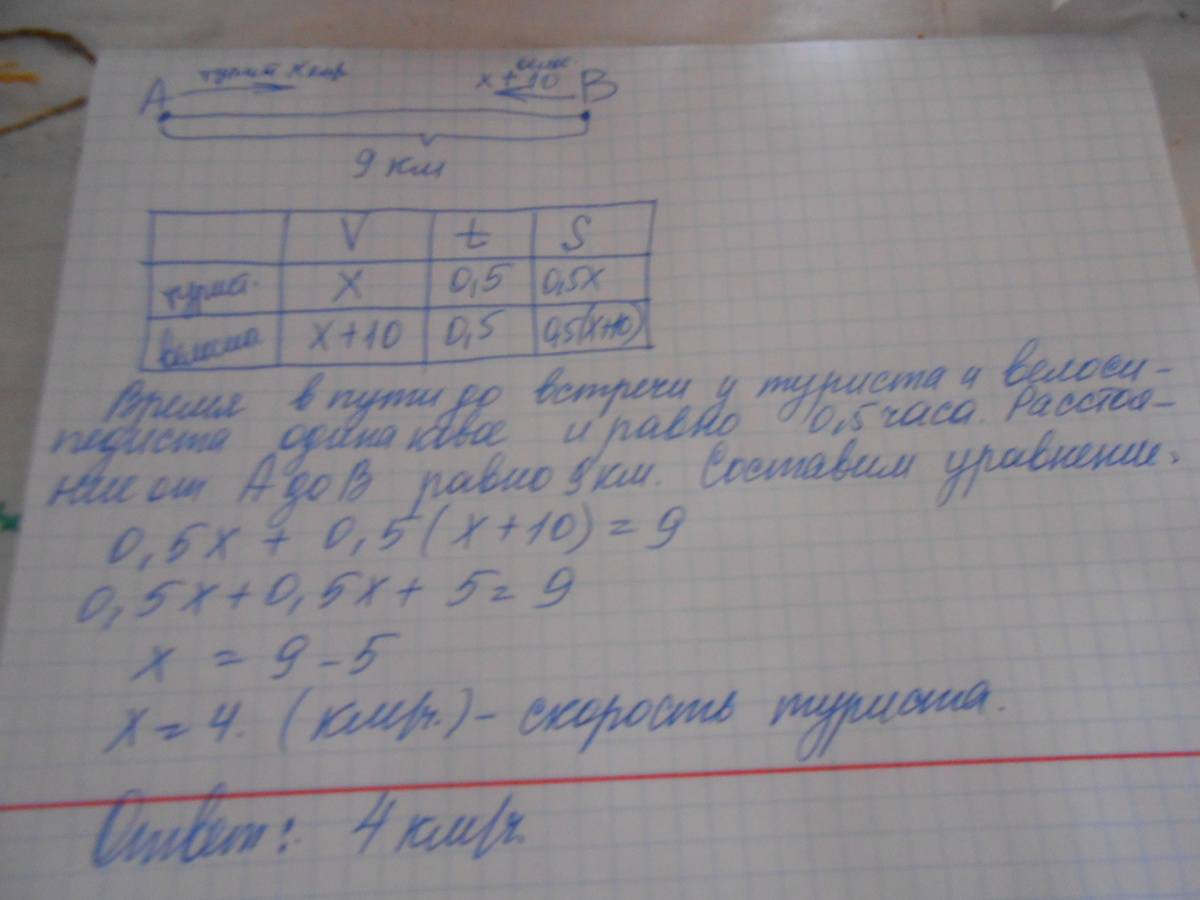турист вышел из пункта Апо направлению в пункт Б, расстояние до которогоравно 9 км.Одновременно с ним из пункта Б выехал велосипедист скорость которого на 10 км больше скорости туриста. Через 0,5 ч они встретились. определите скорость с которой шел турист