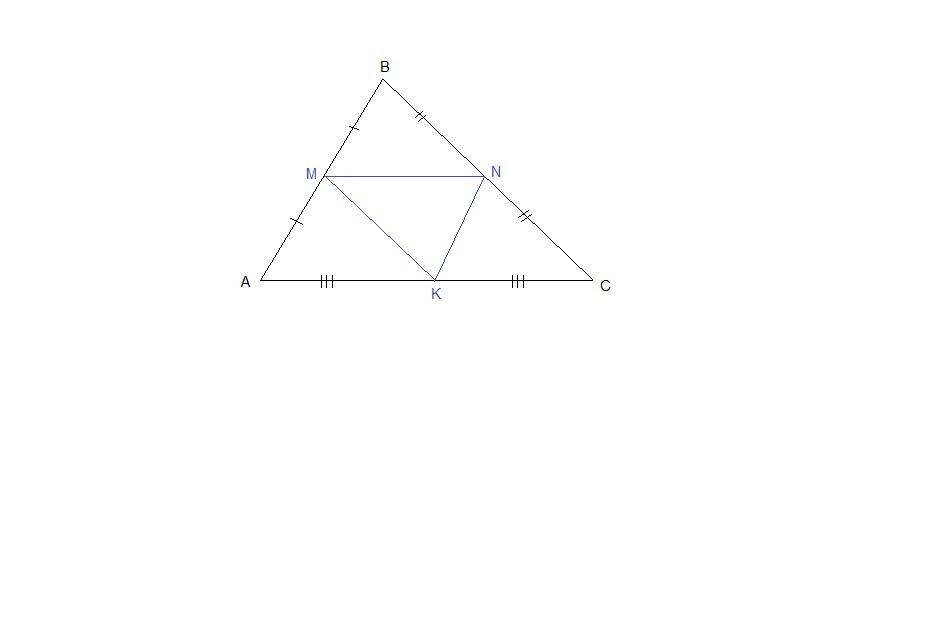 Условие задачи неполное. Точки M, N и К - середины сторон АВ, ВС и АС соответственно (см. рисунок).