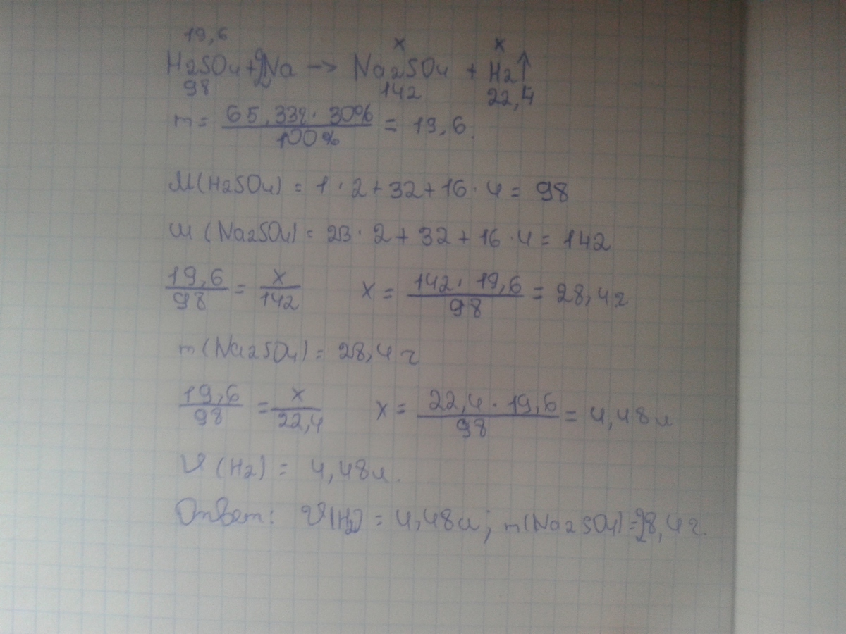 Вычислите массу соли, которая образуется при взаимодействии 65,33г. 30% серной кислоты с натрием. Какой объем водорода при этом образуется?