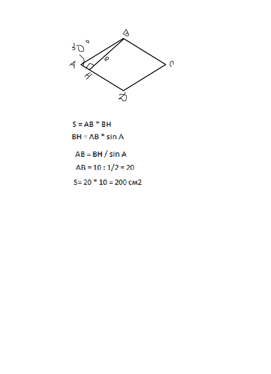 ПОМОГИТЕ СРОЧНО, НАДО!!!!! Найдите площадь ромба, если его высота 10см, а острый угол 30(градусов)