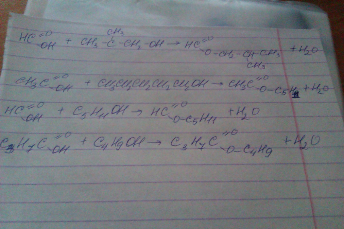 помогите с реакциями получения изобутилформиата, пентилацетата, пентилформиата, бутилового эфира бутановой кислоты