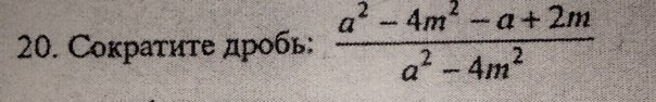 a^2-4m^2-a+2m = сгруппируем слагаемые , поставив перед второй скобкой знак минус изменим знаки во второй скобке = (a^2-4m^2) - (a-2m) = разложим на множители разность квадратов двух выражений = (a-2m)(a+2m)-(a-2m) = Выносим множитель (a-2m), от вычитаемого осталось (a+2m) , от уменьшаемого (-1); Ответ: = (a-2m)(a+2m-1)