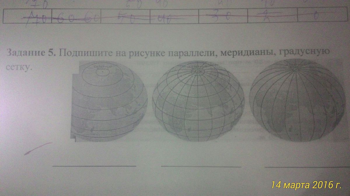 По фото отлично видно первый это параллель, вторая градусная сетка и третий рисунок меридианы, Градусность там тоже хорошо видна если нужно