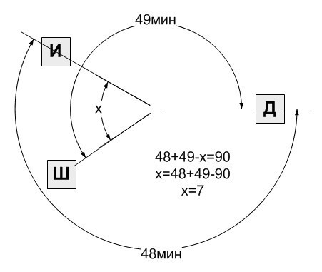 Известно, что от дома до института через школу ехать 48 минут, а от дома до школы через институт — 49 минут. Сколько ехать от школы до института (не через дом)?