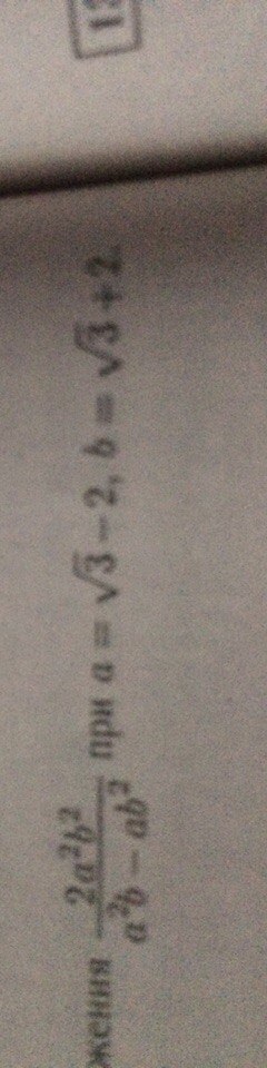 a= √3; b= √3 +2 Решение: 2a^2b^2 / a^2b-ab^2 = 2ab*ab / ab(a-b) = 2ab / a-b= 2*√3*(√3+2) / √3-√3 -b= 2*√3*(√3 +2) / -2= - (√3*(√3+2))= -3 - 2√3