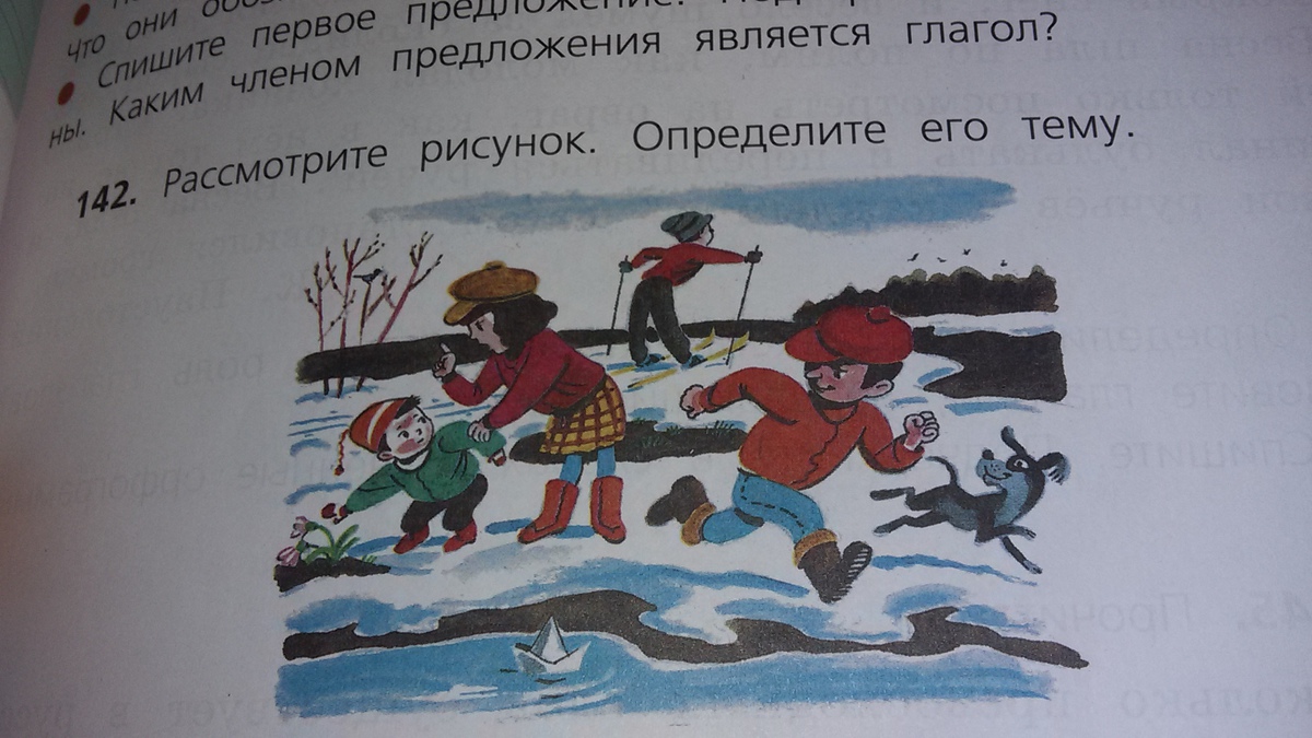 Пришла весна, и снег начал таять. Дети начали запускать по ручьям кораблики, а взрослые рассказывать детям про такие цветы как подснежники. Один хулиган-мальчишка хотел сорвать этот цветок,но мать вовремя остановила его.Некоторые люди увлеченные катанием на лыжах не заметили приход весны.Уже прилетели птицы.Здравствуй,весна!
