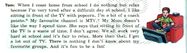Tom:When He comes home from school he does nothing but relax because He's very tired after a difficult day at school. He likes sitting in front of the TV with popcorn. He's a bit of a coach potato. His favourite channel is MTV. His mum doesn't like the way l spend time. She says that sitting in front of the TV is a waste of time. He doesn't agree. They all work very hard at school and it's fair to relax. More than that, l get a lot out of TV. There is nothing He doesn't know about his favourite groups. And it's fun to be a fan!