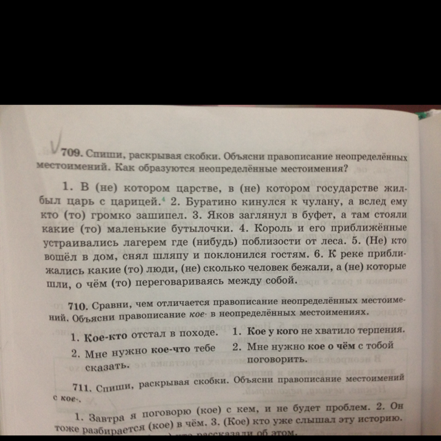 1. В некотором царстве, в некотором государстве жил-был царь с царицей. 2. Буратино кинулся к чулану, а вслед ему кто-то громко зашипел. 3. Яков заглянул в буфет, а там стояли какие-то маленькие бутылочки. 4. Король и его приближенные устраивались лагерем где-нибудь поблизости от леса. 5. Некто вошёл в дом, снял шапку и поклонился гостям. 6. К реке приближались какие-то люди, несколько человек бежали, а некоторые шли, о чем-то переговариваясь между собой.