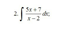 int  frac{5x+7}{x-2} dx=5int  frac{5x+7}{5x-10} dx=5int  frac{(5x-10)+10+7}{5x-10} dx=\\=5int (1+frac{17}{5x-10})dx=5int dx+int frac{17}{x-2}dx=5x+17cdot ln|x-2|+C\\P.S.; ; int frac{dx}{kx+b}=frac{1}{k}cdot ln|kx+b|+C